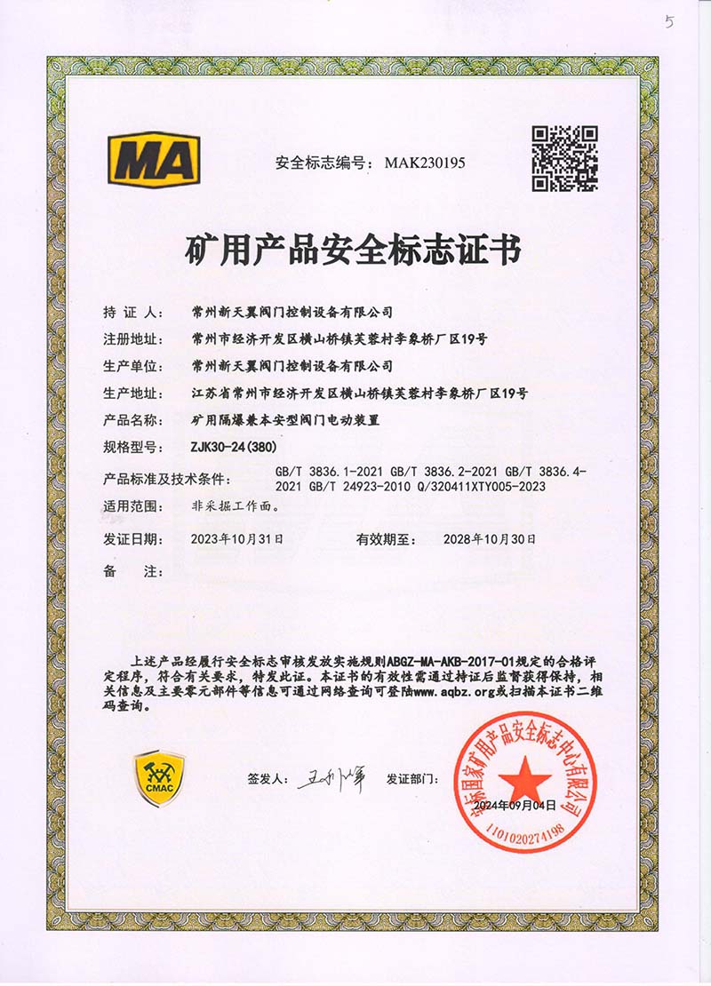 礦用產品安全標志證書ZJK180-24(380)